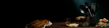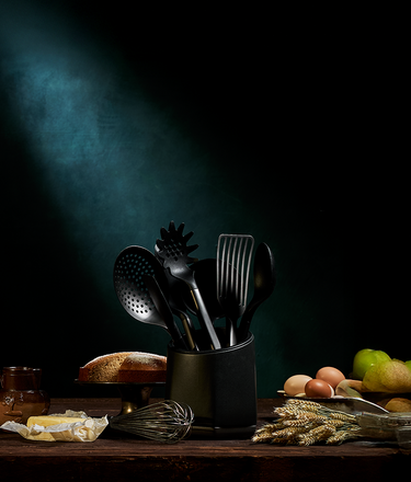 This set of tools specifically designed for our cookware–from a big basting spoon to a nimble fish spatula–features high-grade stainless steel, high temperature–resistant silicone, top-notch craftsmanship and a PVD* gunmetal finish. (Think: Fewer fingerprints.) Sleek and modern at once, a meticulously designed matte black ceramic crock with a silicone liner and nonslip base lend the whole set a polished look.
