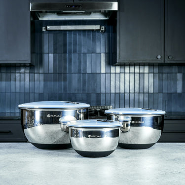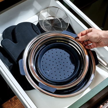 Nesting stainless steel bowls with vacuum-sealing lids. Elegant griddle tools, kitchen utensils and trivets–right this way.